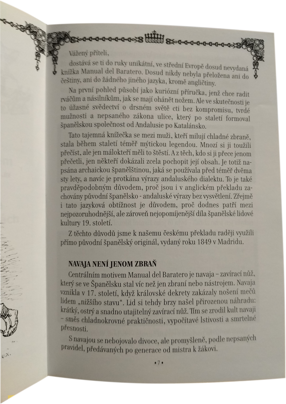 Kultovní příručka umění španělských rváčů, tuláků a andaluských barateros – mistrů lsti a bleskových technik boje nožem. Jejich nejcennějším majetkem byla jejich čest - a proto byli odhodláni bránit ji v krvavých soubojích s nožem v ruce.