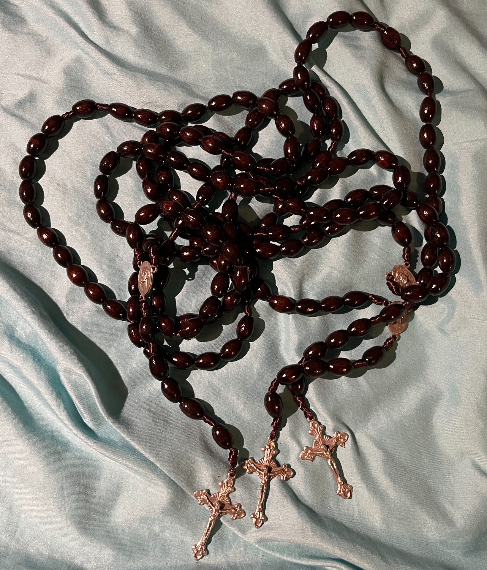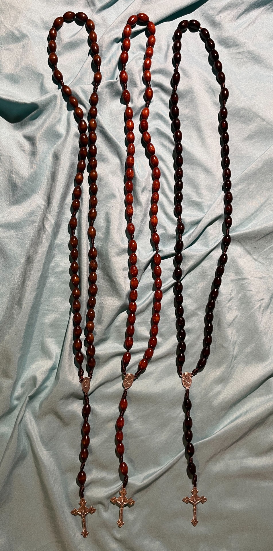Mahagonová: Sytý červenohnědý tón s nádechem ušlechtilosti. Mahagonová varianta působí výrazněji a slavnostněji – skvělá volba pro toho, kdo chce růženec s výrazným charakterem a mystickou hloubkou.