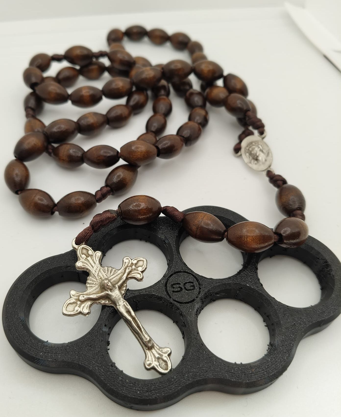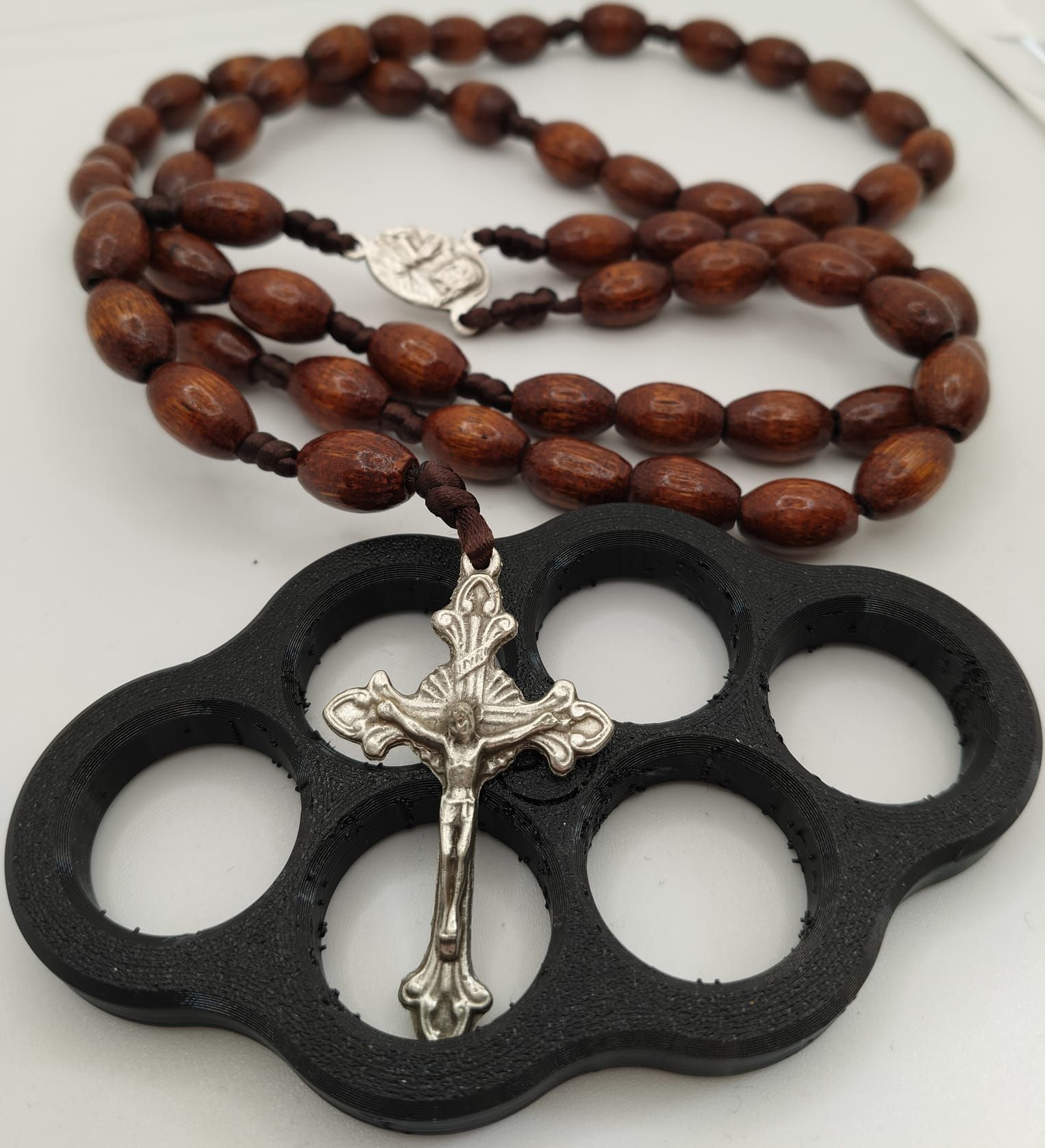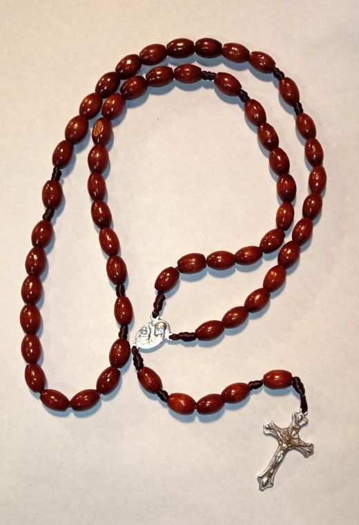 V nataženém stavu má délku 65 cm. Je vyroben z masivních oválných dřevěných zrn, medailka a krucifix jsou ze stříbřité kovové slitiny. Celkově působí důstojně a elegantně.